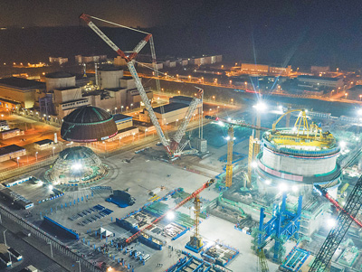 图为21日凌晨,3号机组内穹顶正在吊装。