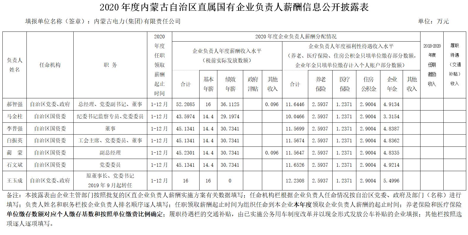2020年度内蒙古自治区直属国有企业负责人薪酬信息公开披露表