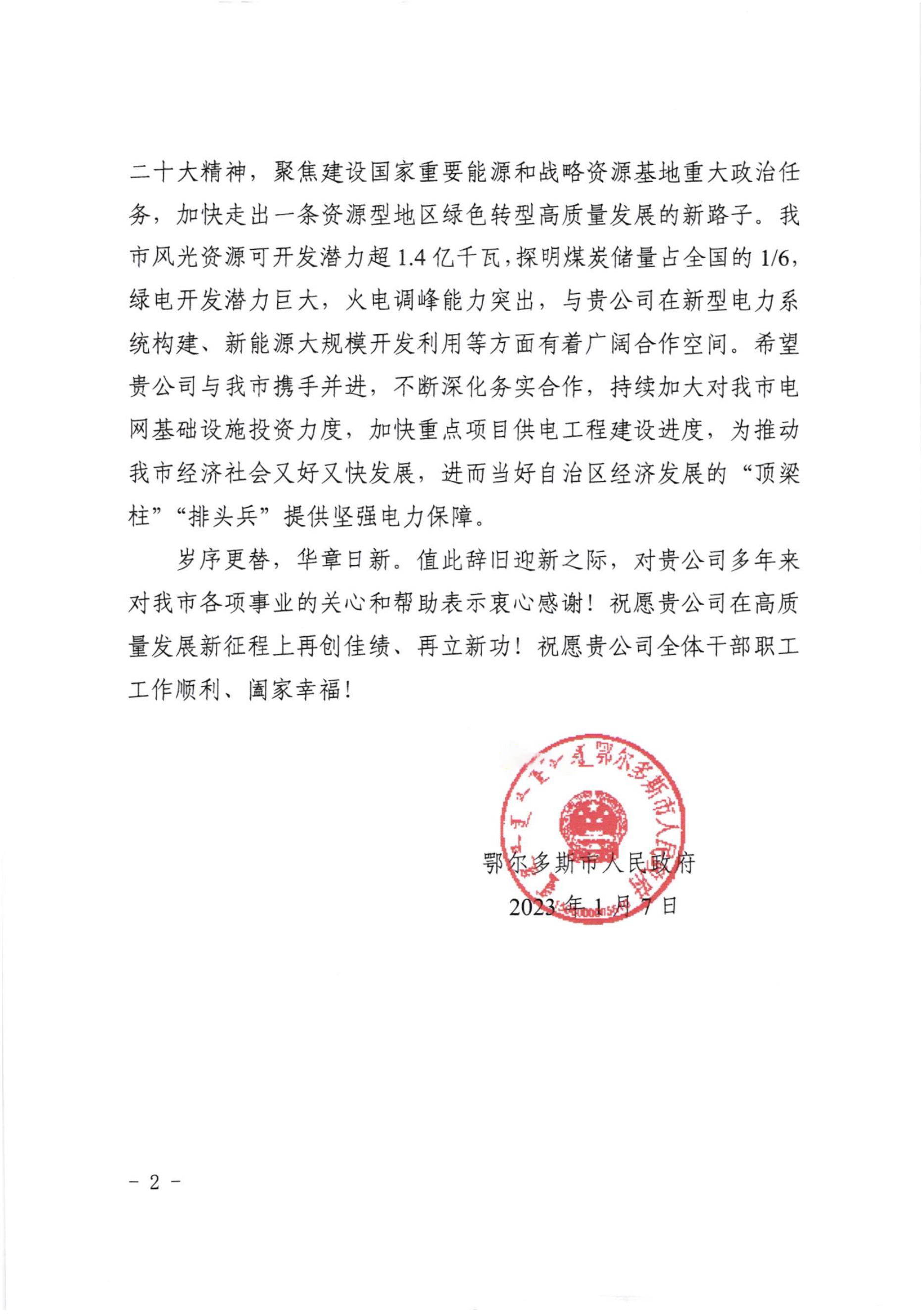 春山在望,未来可期。新的一年,我市将深入贯彻落实党的二十大精神,聚焦建设国家重要能源和战略资源基地重大政治任务,加快走出一条资源型地区绿色转型高质量发展的新路子。我市风光资源可开发潜力超1.4亿千瓦,探明煤炭储量占全国的1/6, 绿电开发潜力巨大,火电调峰能力突出,与贵公司在新型电力系 统构建、新能源大规模开发利用等方面有着广阔合作空间。希望贵公司与我市携手并进,不断深化务实合作,持续加大对我市电网基础设施投资力度,加快重点项目供电工程建设进度,为推动 我市经济社会又好又快发展,进而当好自治区经济发展的“顶梁柱”“排头兵”提供坚强电力保障。