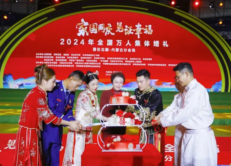 9月22日,由全国妇联、国家民委、民政部、农业农村部、中央军委政治工作部联合举办的“家国同庆 见证幸福”2024全国万人集体婚礼在全国50个会场盛大举行,来自内蒙古电力集团的13对新人相聚内蒙古分会场敕勒川草原千人会议中心,共庆祖国华诞,见证百年之好。