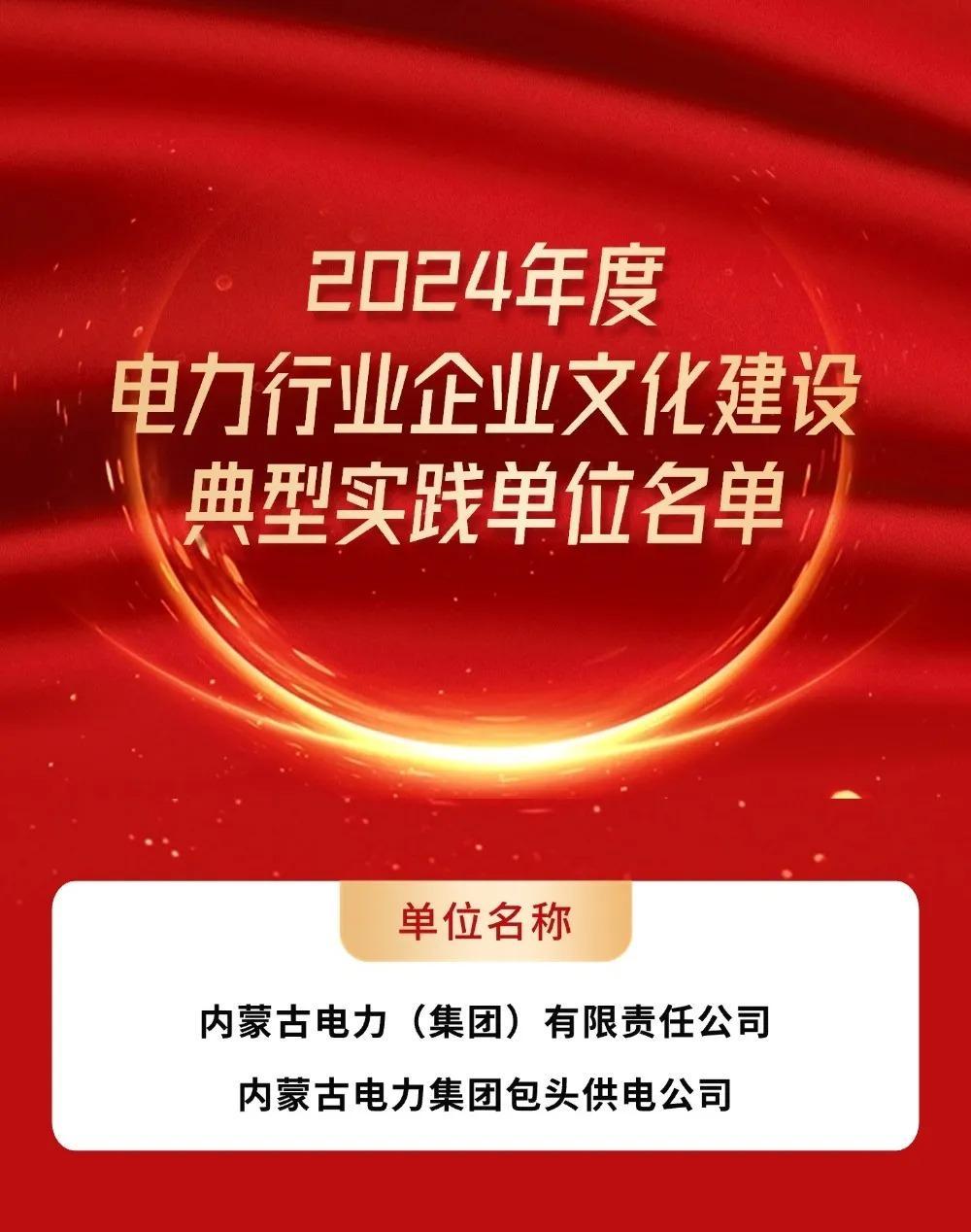 近日,中国电力企业联合会发布《2024年度电力行业企业文化建设典型成果及典型实践单位名单》,内蒙古电力集团企业文化建设成果喜获丰收,集团公司及包头供电公司获评“2024年度电力行业企业文化建设典型实践单位”,8项成果入选“2024年度电力行业企业文化建设典型成果”。