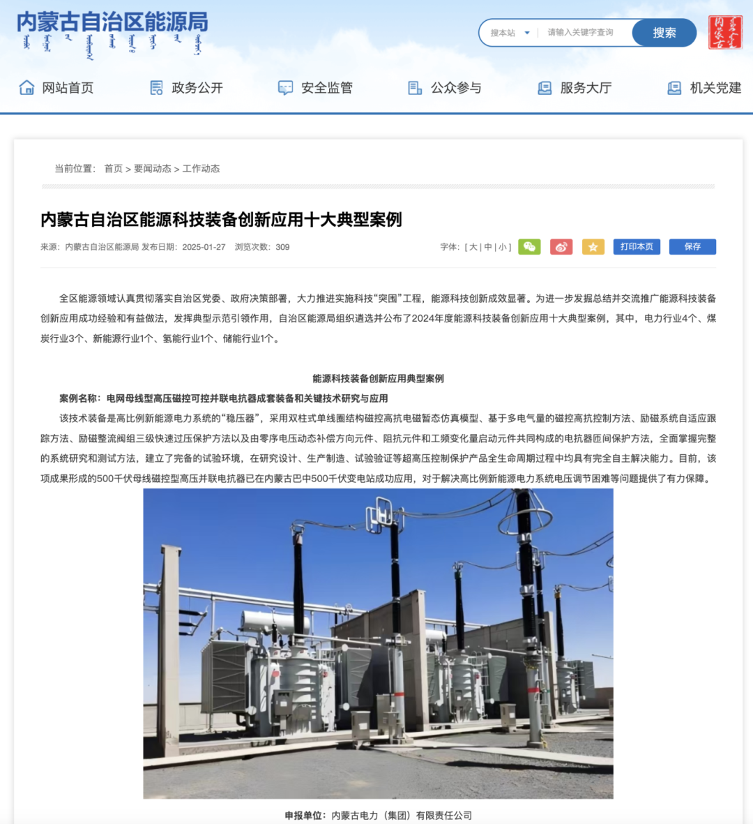 近日,内蒙古自治区能源局正式发布2024年度能源科技装备创新应用十大典型案例评选结果。乌海超高压供电公司“电网母线型高压磁控可控并联电抗器成套装备和关键技术研究与应用项目”成功入选,实现了乌海超高压供电公司在自治区级能源科技装备创新领域奖项从零到一的历史性突破,为集团公司推进科技“突围”,提升科技创新能力注入强劲动能。