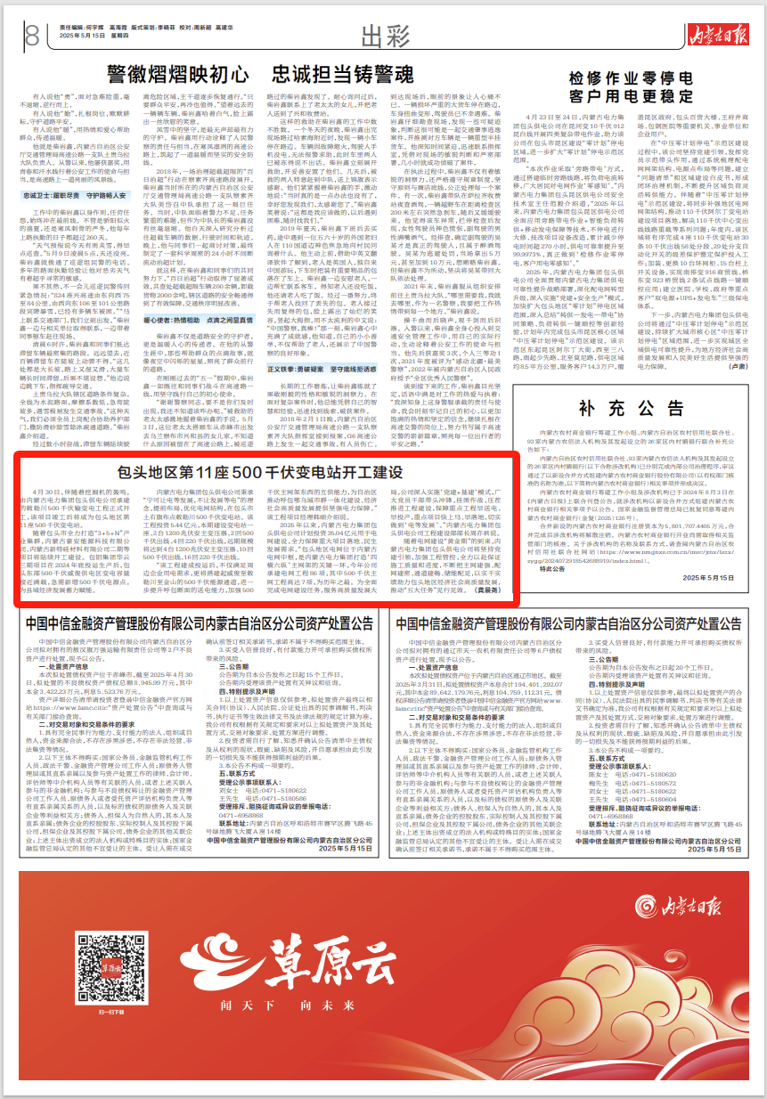 随着电网建设“黄金期”的到来,内蒙古电力集团包头供电公司将坚持党建引领,加强工程管控,全力以赴保证施工质量和进度,不断把主网建强、配网建密、通道建畅、储能配足,以实干实绩助力包头地区经济社会高质量发展,推动“五大任务”见行见效。