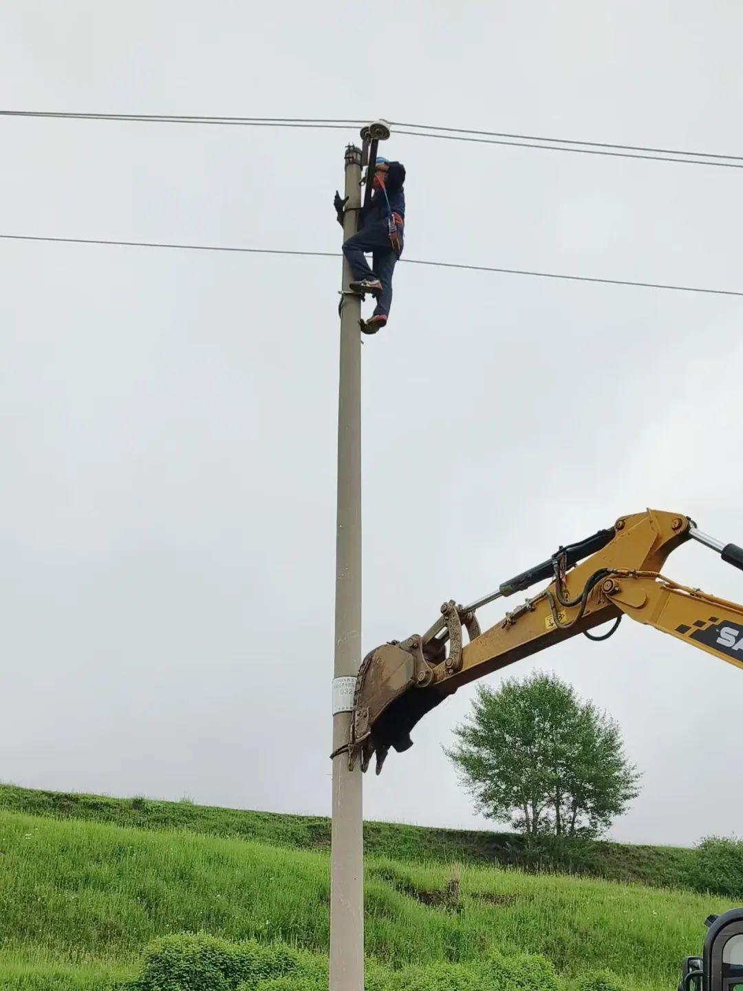 “刚到的时候现场一片狼藉,队员们扛着设备卷起裤腿就冲进泥水里,恢复送电一秒都不敢耽误!”丰镇供电公司黑土台供电所所长刘晓菲介绍,工作人员克服道路受阻、作业面湿滑等困难,有序推进电杆扶正、更换及断线修复工作。