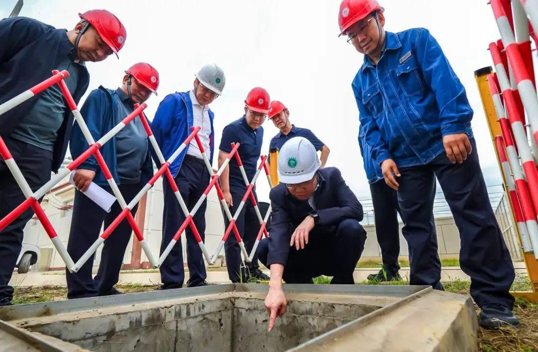 张晓虎一行实地察看变电站和输电线路附近水情、抽水排涝、设备防护、预警响应、值班值守和应急准备等工作。