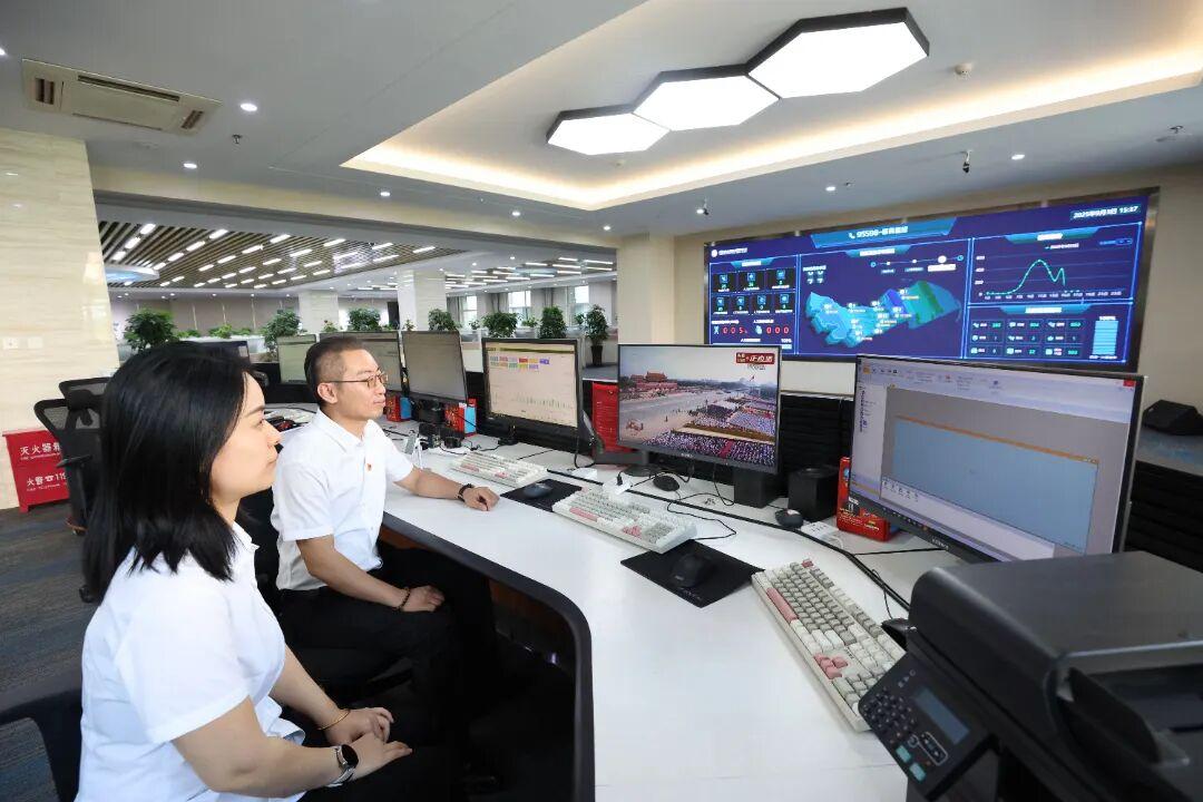 集团公司部分在家领导班子成员、机关部门负责人在应急指挥中心,与相关供电单位、一级保电变电站进行保电值守工作视频连线,在会场同步观看直播。