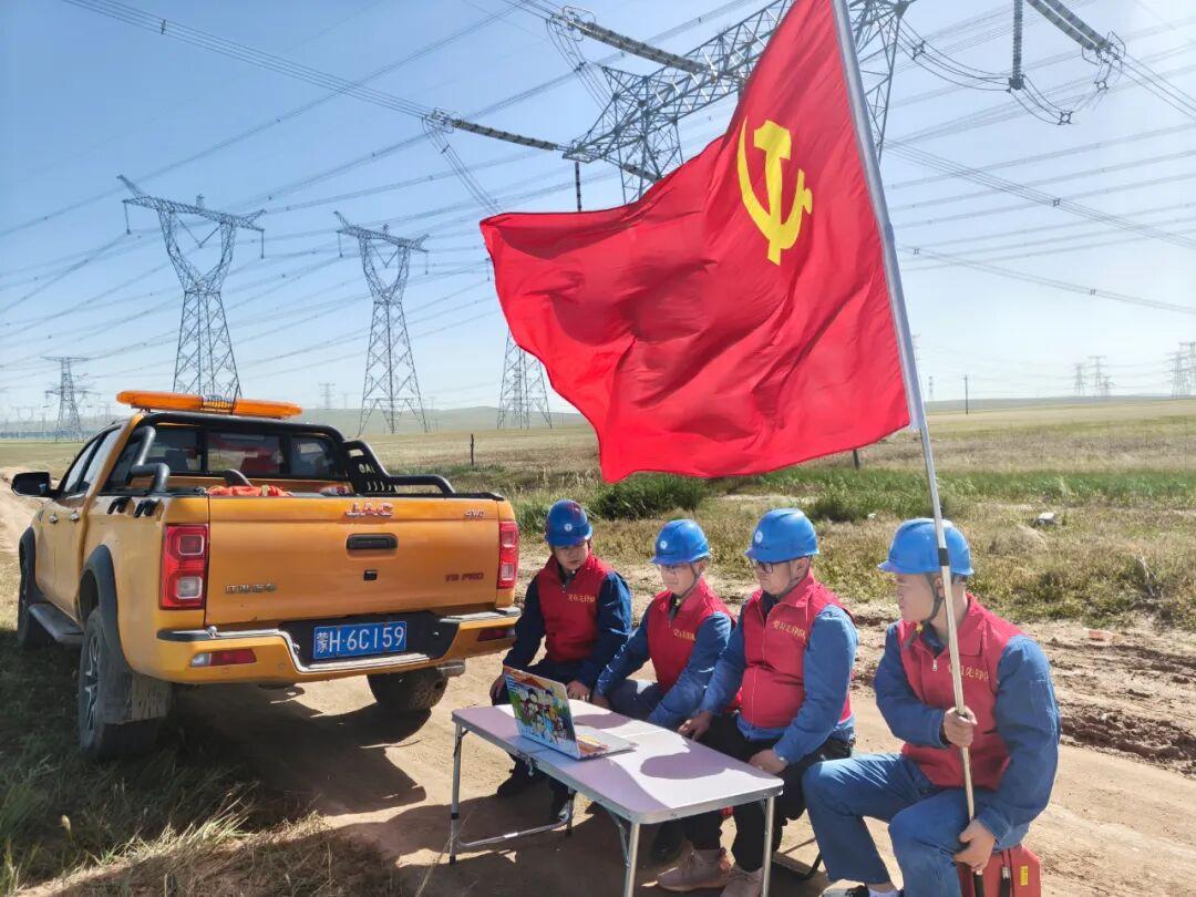 锡林郭勒供电公司保电人员在草原上的铁塔下观看直播。