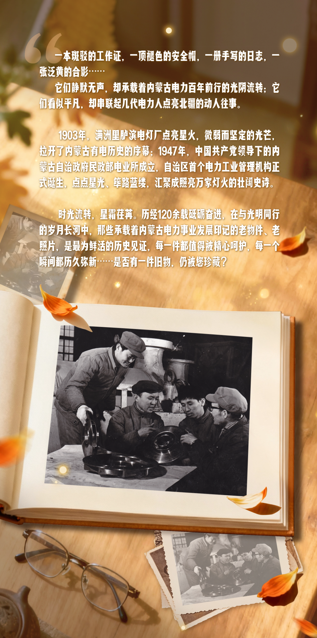 在此,我们面向关心、支持内蒙古电力事业的社会各界人士、离退休老同志、在职员工及家属们,公开征集具有时代意义的老物件、老照片等,诚盼您踊跃参与。