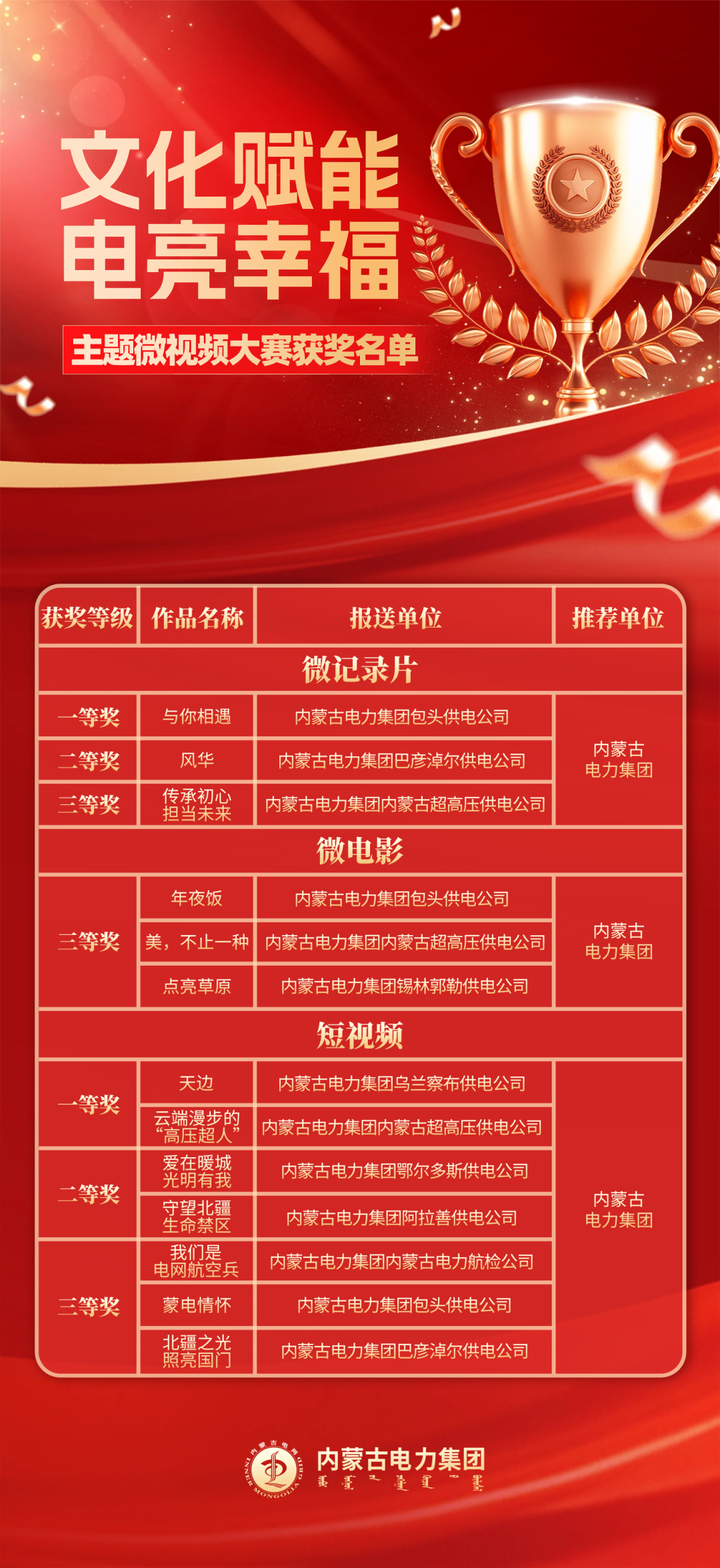 本次大赛由中国电力企业联合会与电力文学艺术协会联合主办,是全国电力行业文化建设的重要赛事,旨在通过微视频载体挖掘行业文化积淀,展现电力企业的责任担当。内蒙古电力集团高度重视此次赛事,所属各单位结合地域特色与工作实际踊跃参与,最终形成一批兼具思想深度与艺术感染力的精品力作。在获奖作品中,微纪录片《与你相遇》、短视频《天边》《云端漫步的“高压超人”》凭借独特视角脱颖而出斩获一等奖。《风华》《守望北疆 生命禁区》等3部作品荣获二等奖,立体呈现了蒙电人守护电网安全的坚守。《爱在暖城 光明有我》《年夜饭》等7部作品则聚焦民生场景,让“人民电业为人民”的企业宗旨通过生活化叙事直抵人心。这些作品普遍以小切口展现大主题,生动刻画了蒙电人坚守北疆、服务民生的奋斗群像,真情讲述了集团在保障能源安全、服务绿色发展、促进民族团结中的动人故事,让观众看到了蒙电人的血肉与情感,实现了行业叙事与大众共鸣的完美结合。