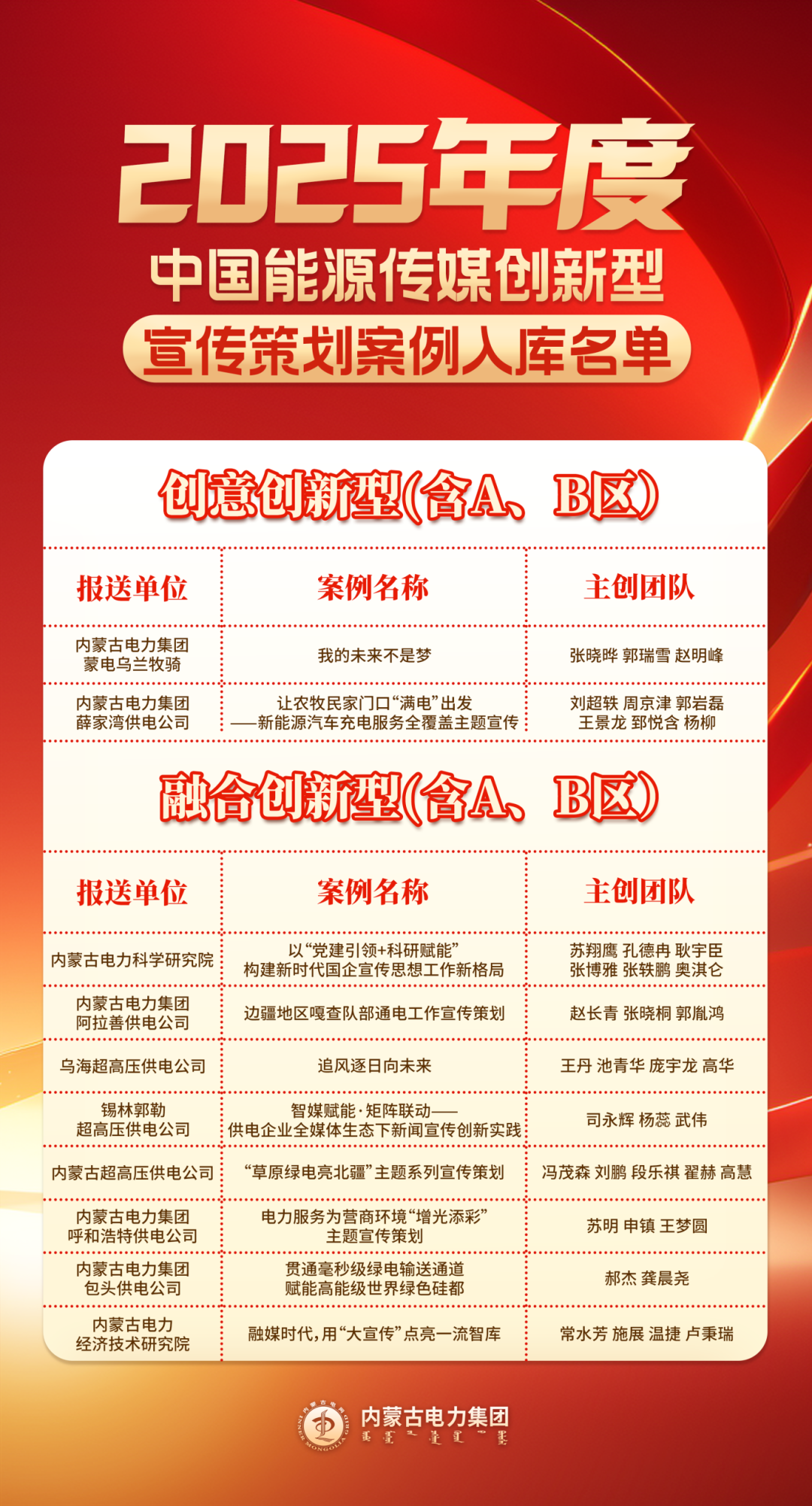 11月27日至28日,“2025年中国能源传媒宣传策划工作会”召开,会议同期举行中国能源传媒宣传策划案例库启动仪式及入库案例颁奖环节。内蒙古电力集团凭借扎实的宣传策划功底、鲜明的草原能源特色与创新的传播实践,多部作品及多个宣传团队成功入选2025年度中国能源传媒典型宣传策划案例库,斩获多项荣誉,充分彰显了在能源宣传领域的过硬实力与创新成效。