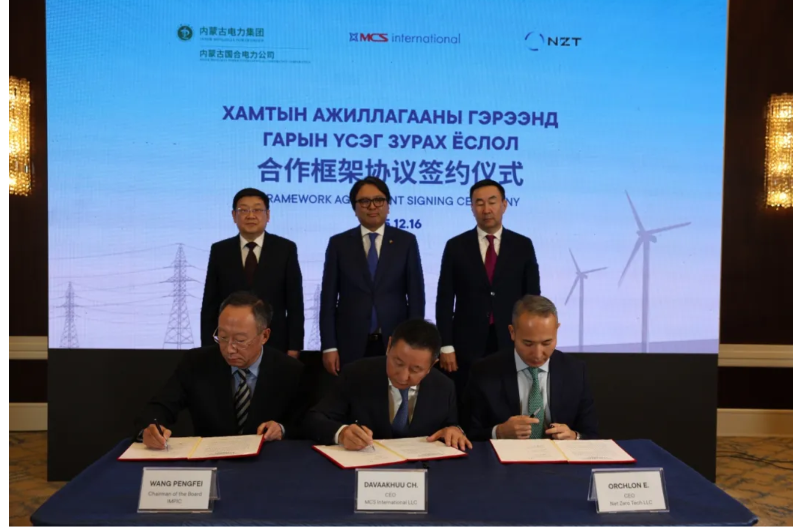 12月16日下午,内蒙古电力集团与蒙古国大型企业MCS集团进行磋商,重点就“源——网——荷——储”一体化系统规划展开交流,以及各自发挥技术专长、资源禀赋,共建区域可再生能源产业链协同发展,助力蒙古国实现绿色转型发展达成共识,其间内蒙古国合电力公司与MCS国际公司、净零科技公司签署《合作框架协议》,蒙古国副总理道尔吉汗达出席并见证。