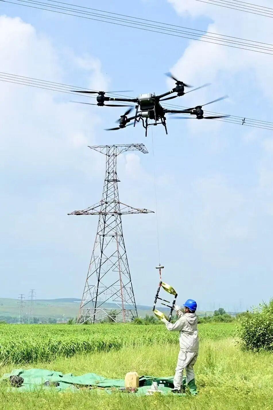 高空中,无人机缓缓飞升到一定高度,替代机械臂进行巡线;